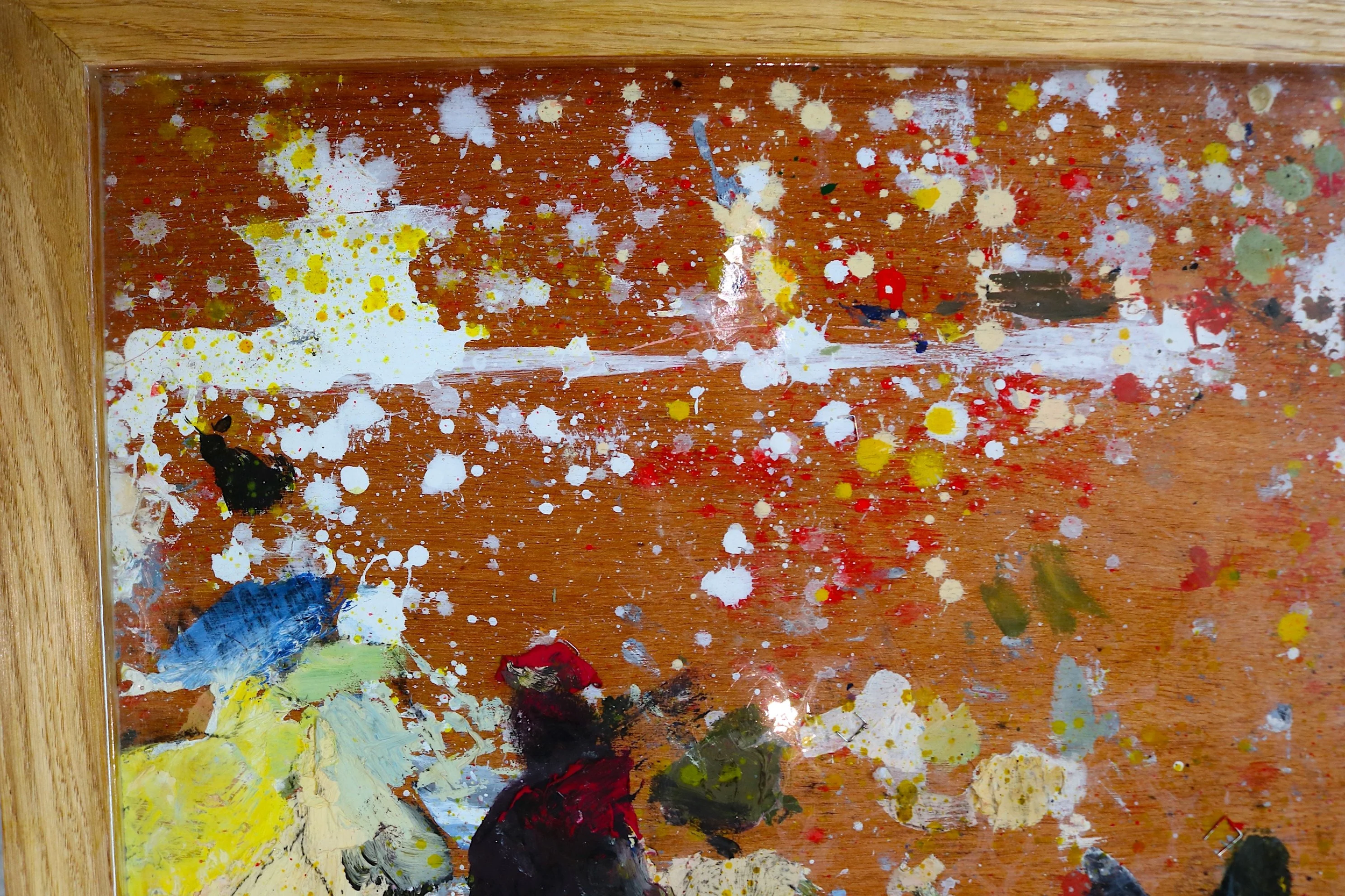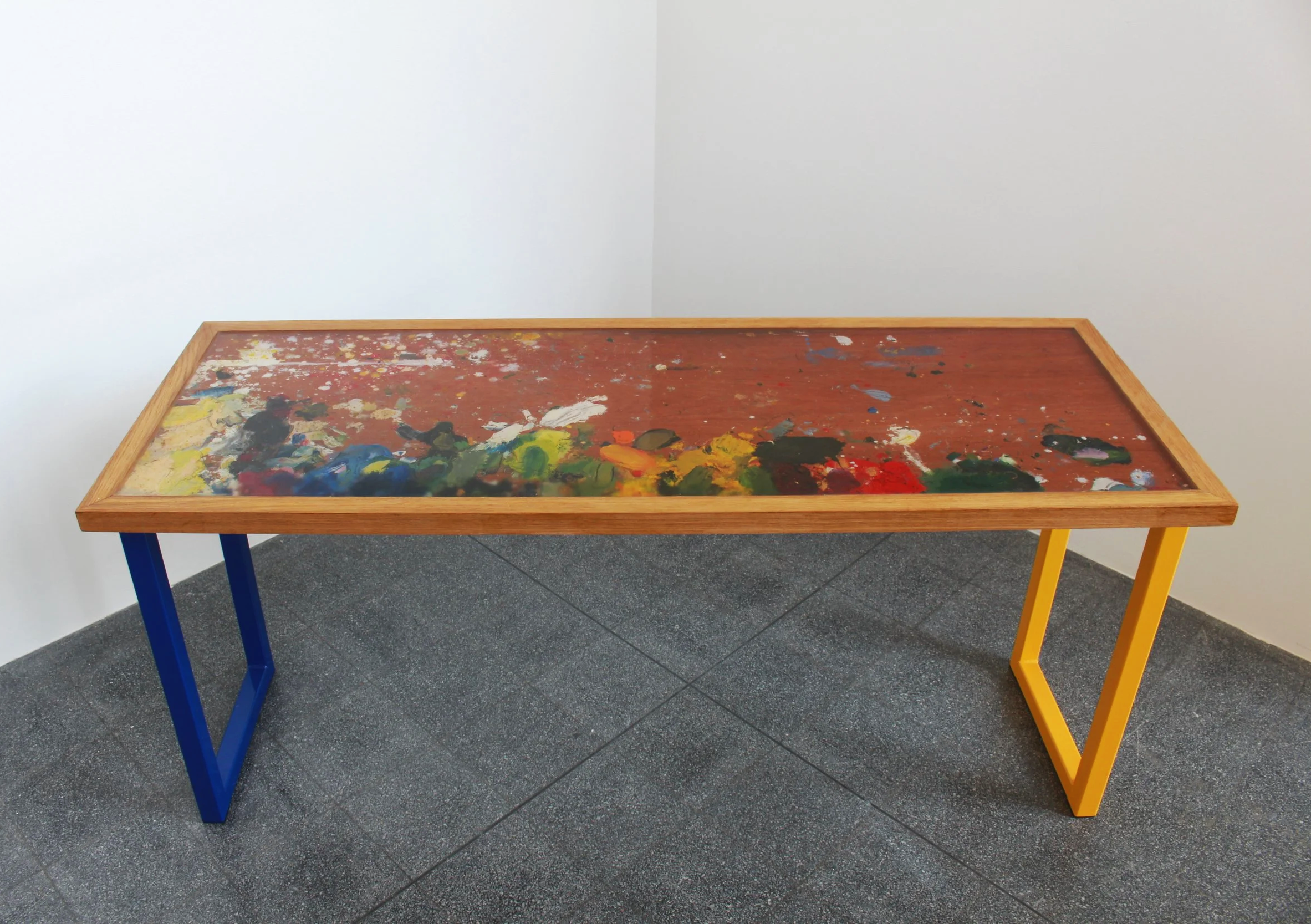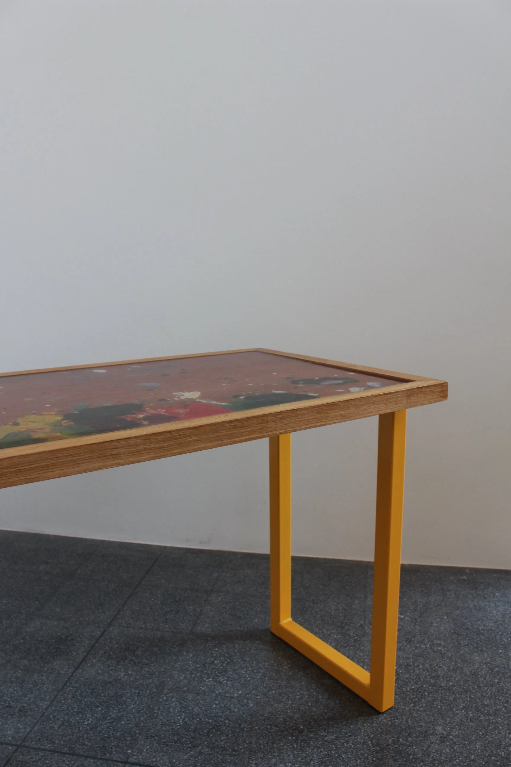 The centre of this table is formed from a reclaimed wooden door, rescued from a skip and previously used as a working palette by a fine art student. Layers of paint and texture have built up through repeated use, creating a surface that functions as an artwork in its own right.
