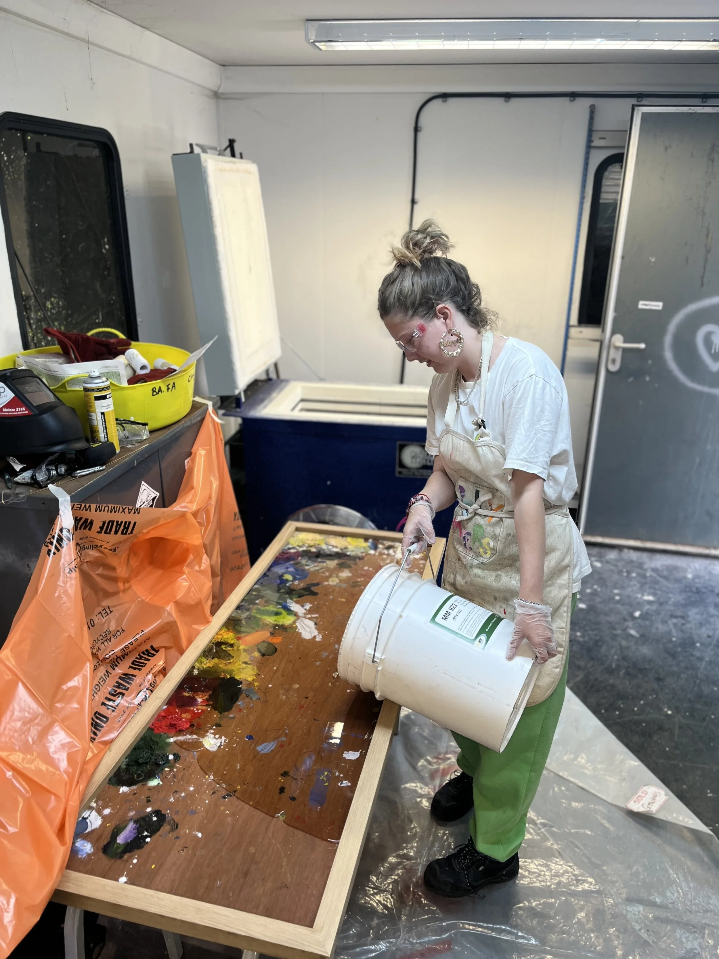 Rather than removing these marks, the original surface has been preserved and encapsulated in resin, fixing a moment of creative process while allowing it to take on a new, functional life. The piece sits between furniture and artwork, carrying the history of its making into a domestic setting.